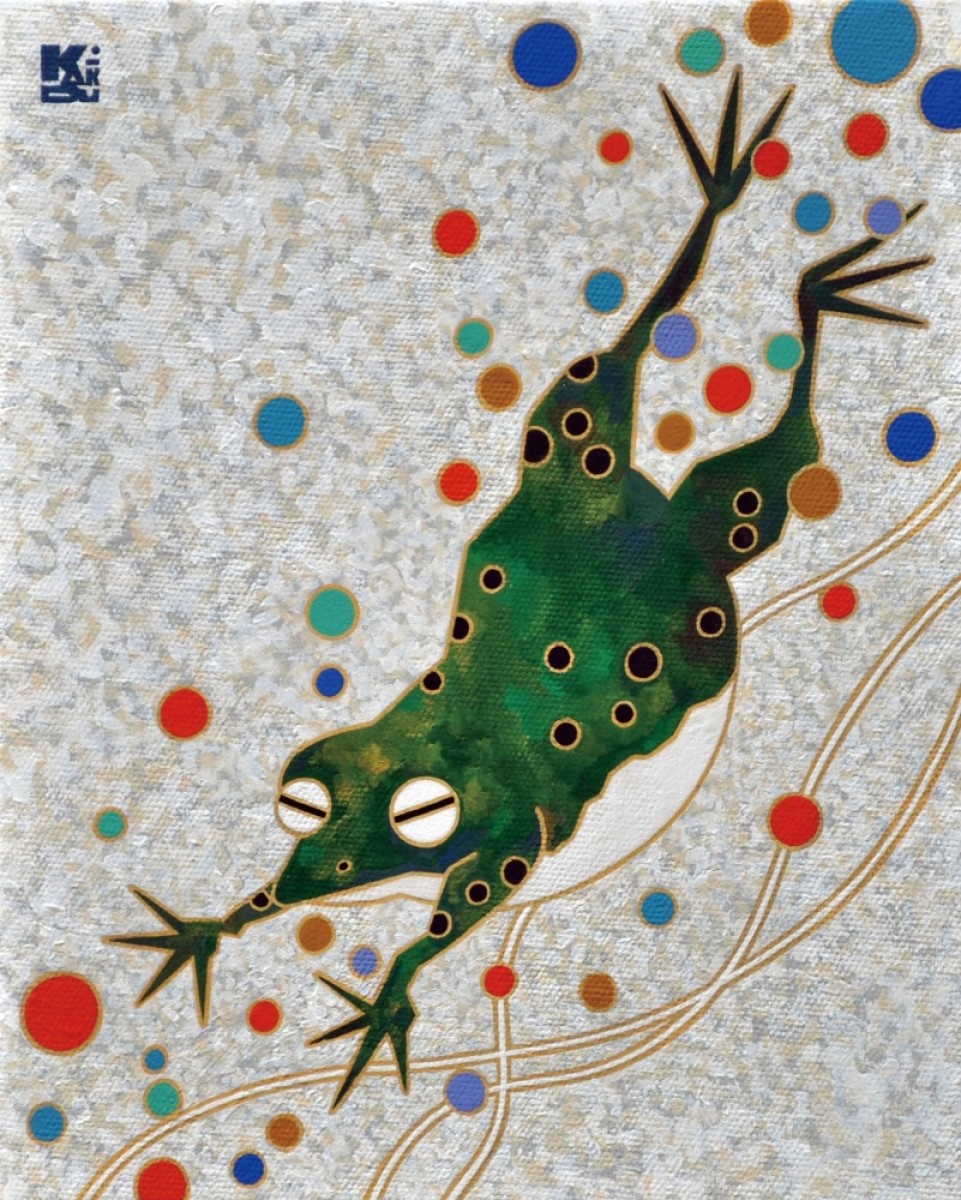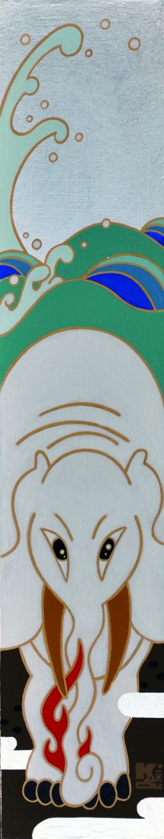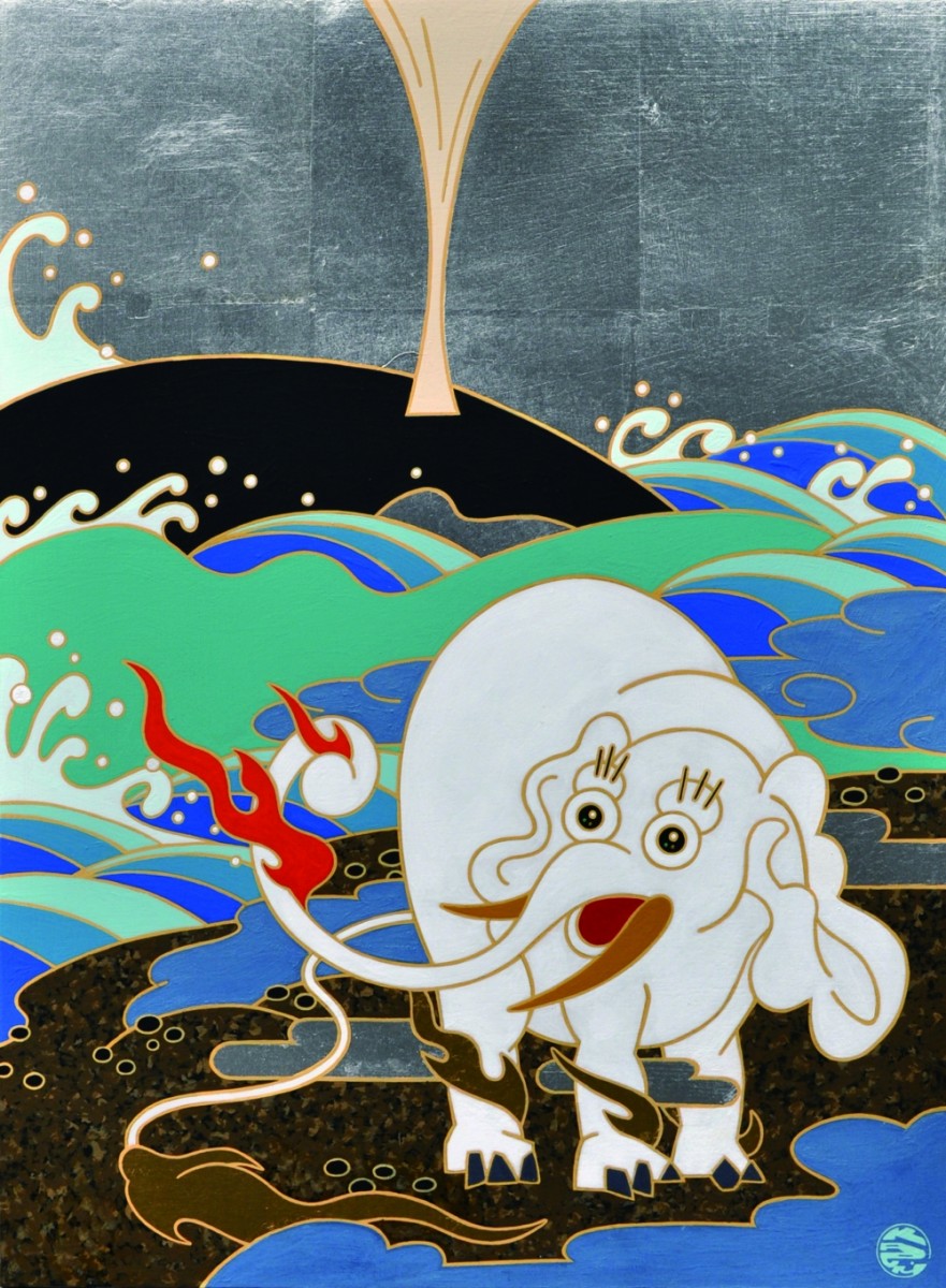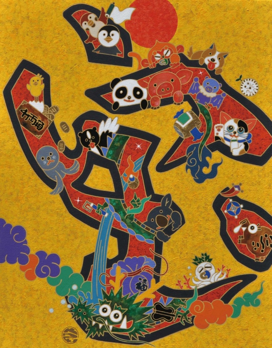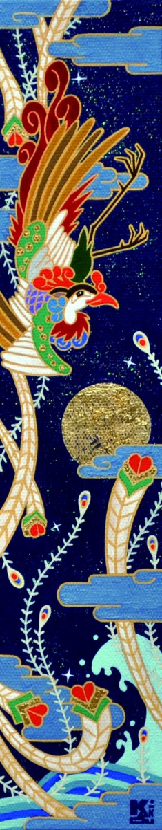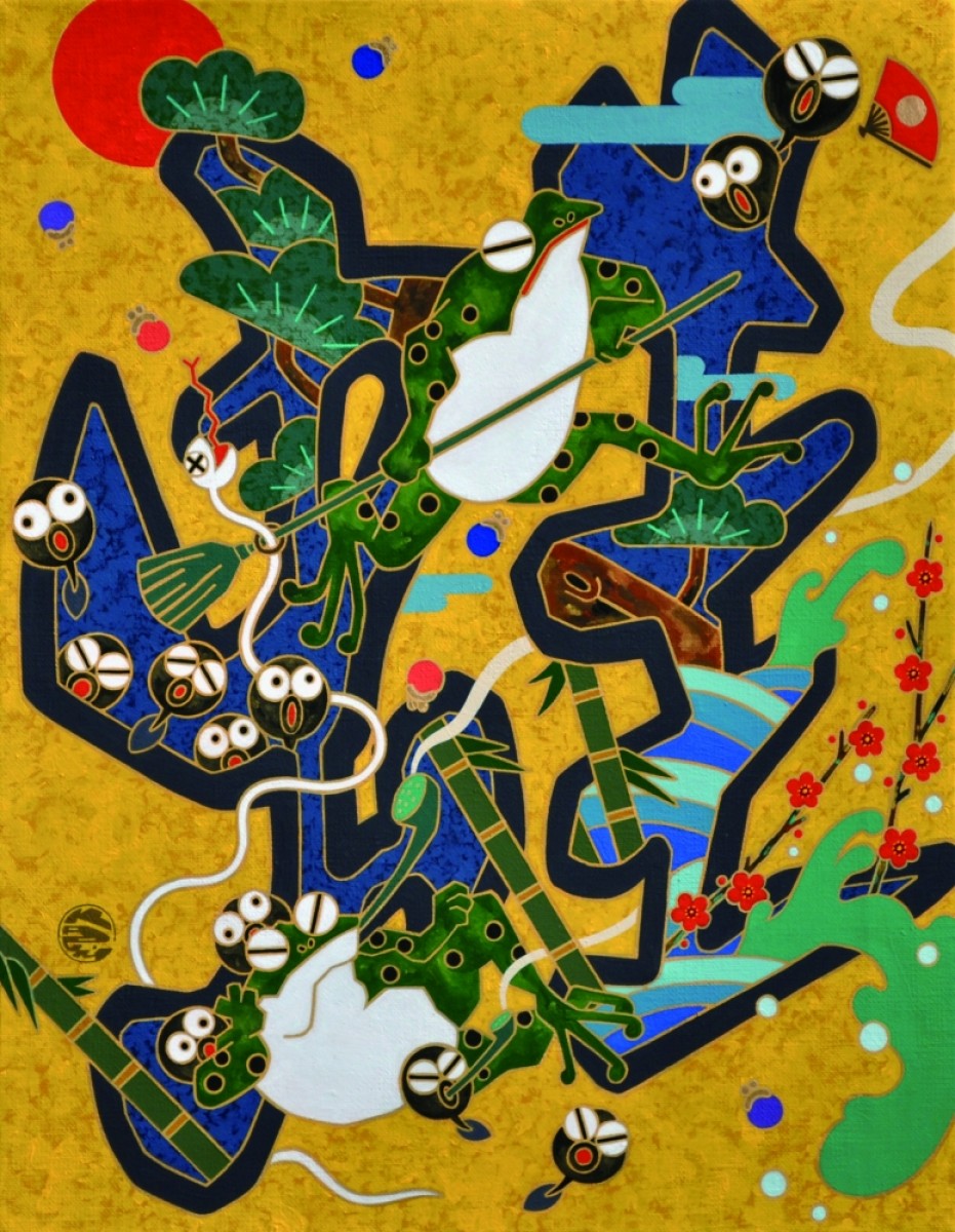 キャンバスにアクリル、金箔、箔、純金泥
