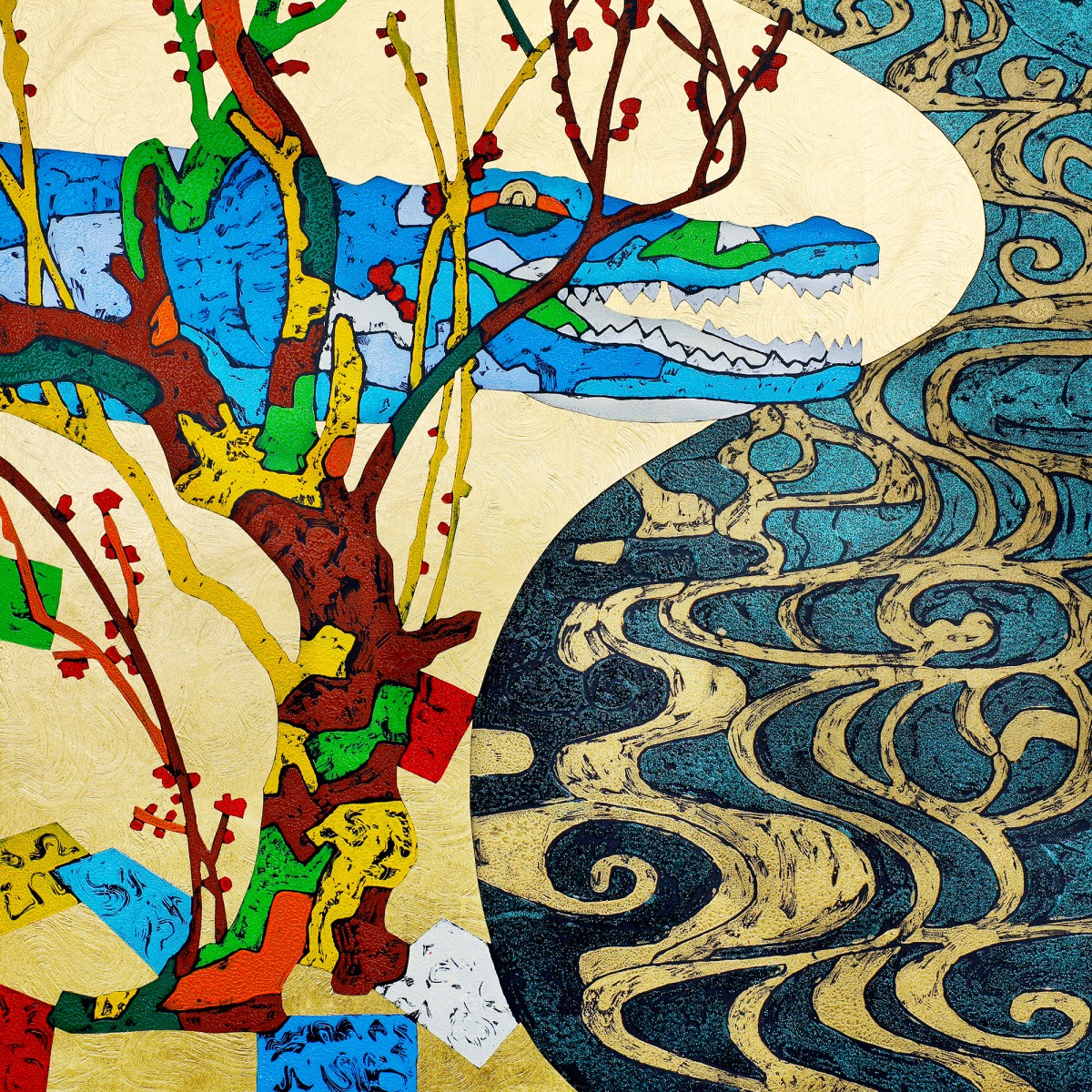 木版モノタイプ/油絵具、黒紙、本金箔