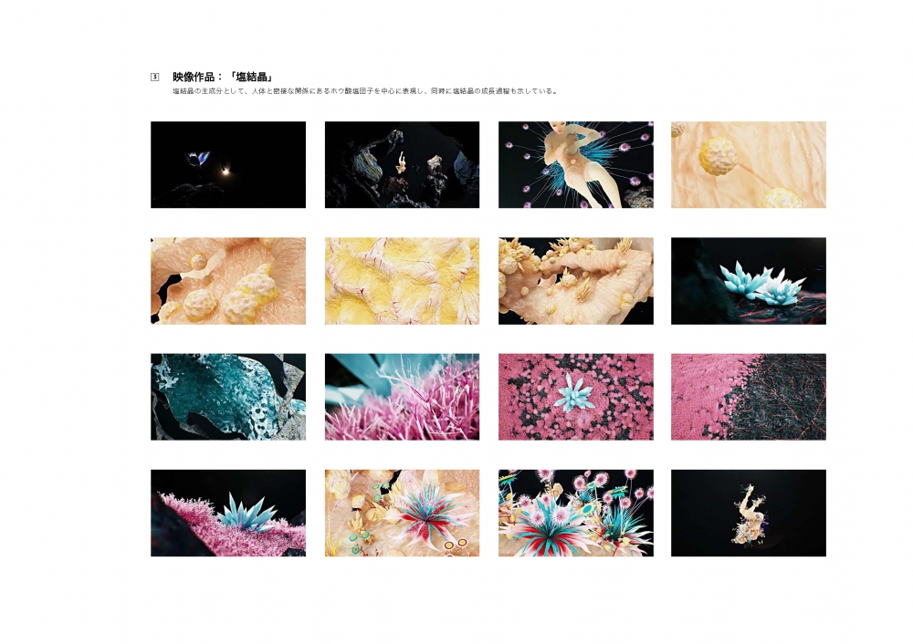 生物・鉱物由来の素材にしたインスタレーション、3DCG アニメーション、インタラクティブ作品